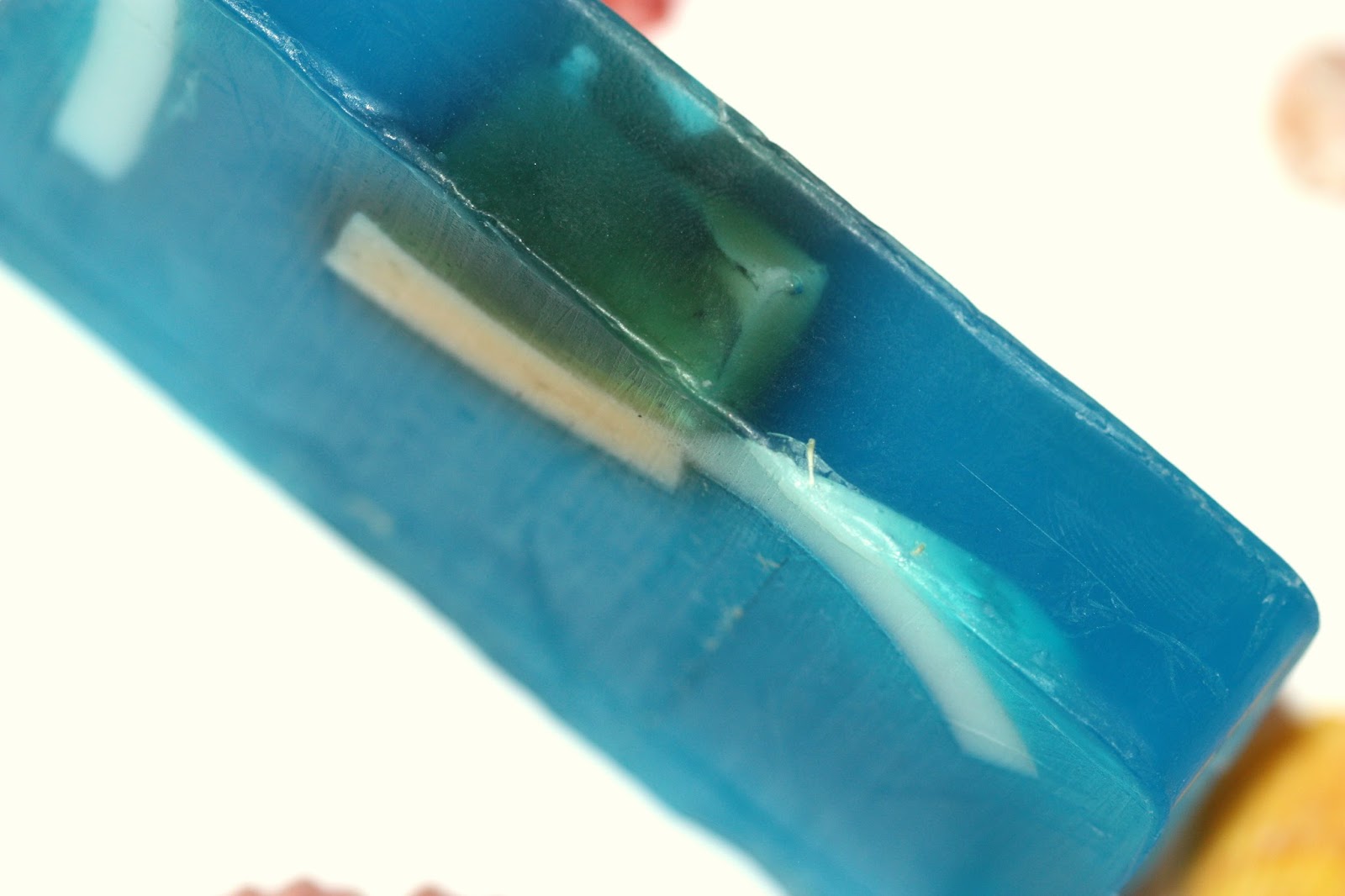 Мыло ярко синее, прозрачное и похоже на льдинку. Внутри него диковенные вкрапления кусочков мыла белого и темно зеленого цвета. Ну вот опять я вижу море....море, водоросли, кораллы...Ничего не могу с собой поделать)